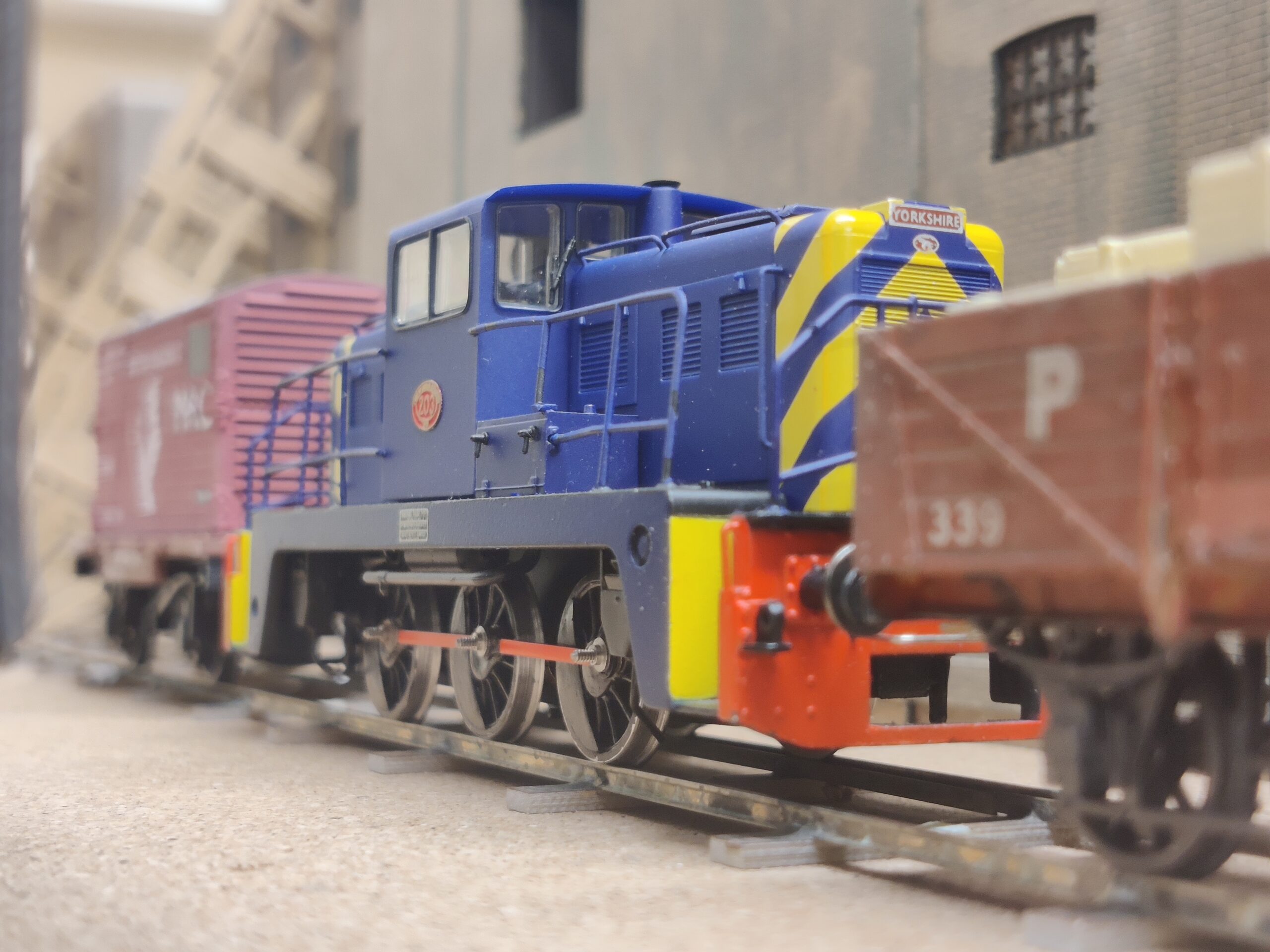 Layout photo: shows railway wagon and loco in front of brick built warehouse