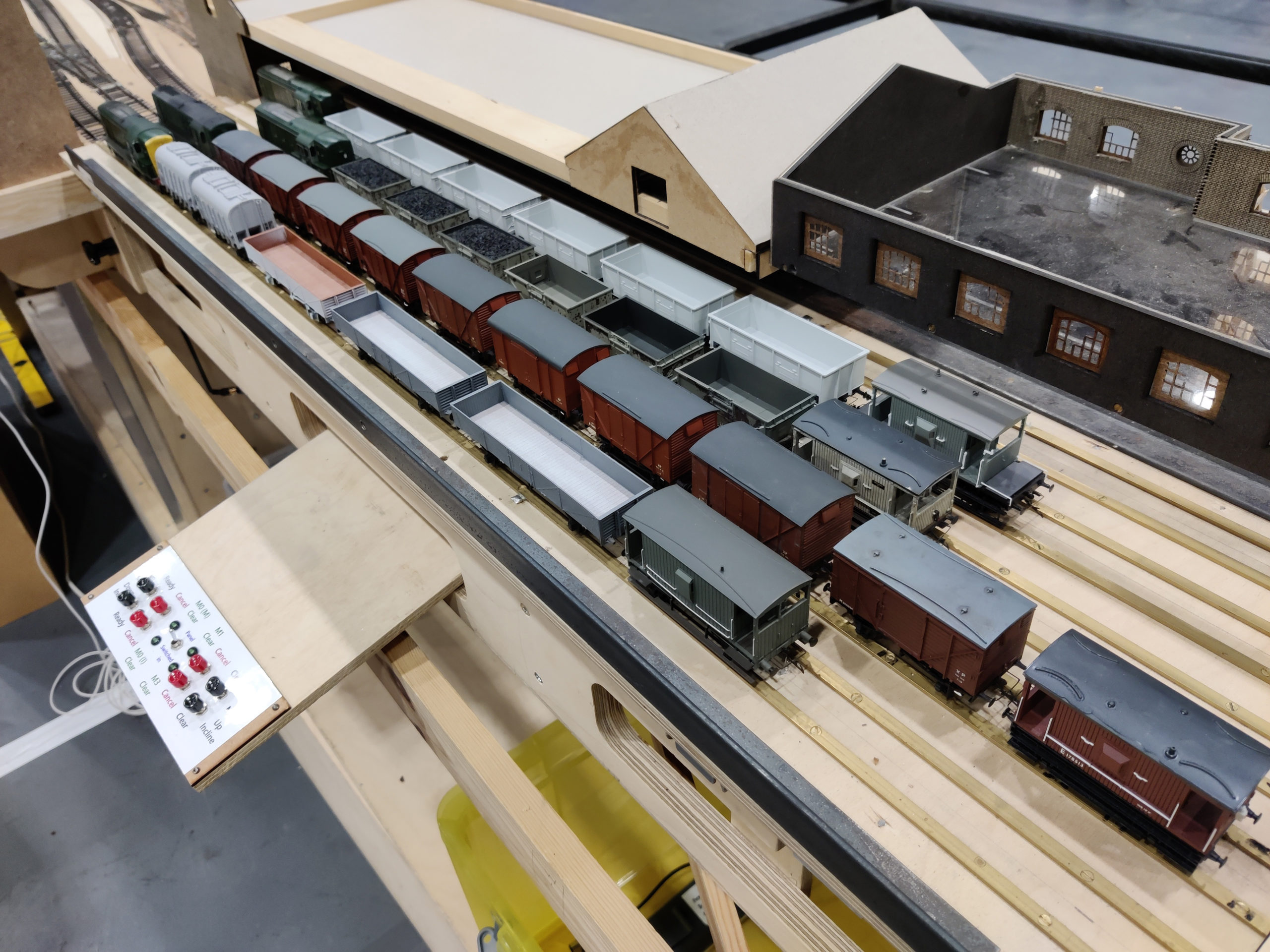 Trackwork is a mixture of C&L track with bullhead rail, flat bottom rail soldered to copper-clad sleepers, and brass strip in some of the storage sidings. The dockside track is of the second type of construction, with an added brass inner checkrail, as the these tracks will be set into a concrete surface. Locomotive control is DCC, using MERG equipment, while layout control (points, signals, etc.) is by CBUS. Most couplings are Sprat & Winkle, which require an underboard magnetic uncoupler. Rather than use electromagnets, we are using rare earth magnets that swivel by means of a servo. These magnets are strong enough to operate the couplings through the 6mm plywood baseboard + 3mm of cork underlay. For use on the trains that shuttle back and forth along the main lines, some wagons are fitted with magnetic couplings, to ease the swapping out of vehicles. For the buildings, considerable use has been made of an in-house laser cutting facility. This allows every building to be individually designed and built, but takes time.