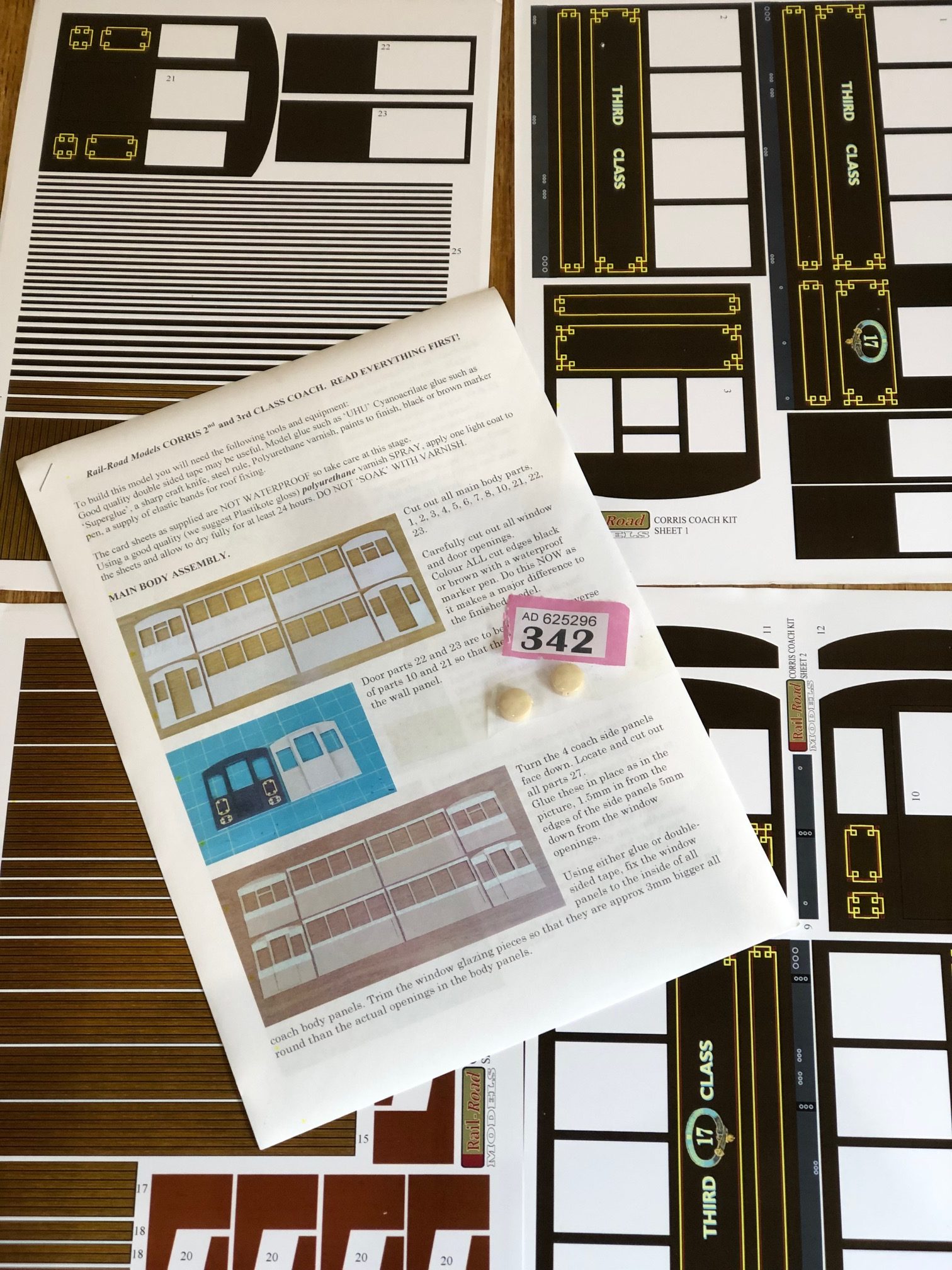 Card garden scale kit. Kit looks complete and unstarted, except for the bogies wheels. Can be built to 32mm or 45mm gauge. For more details, see https://www.rail-roadmodels.co.uk/product-page/corris-3rd-class-coach-body